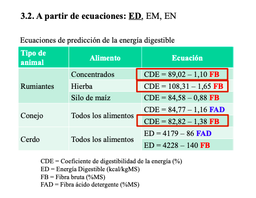 | Concentrados (rumiantes) | CDE = 89,02 – 1,10 FB |