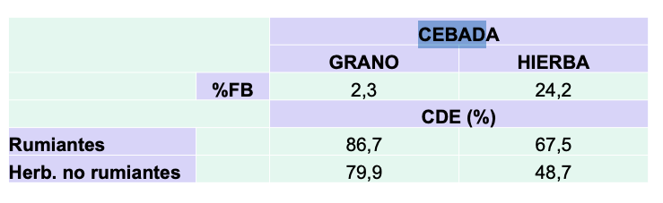 | Hierba (rumiantes) | CDE = 108,31 – 1,65 FB |
