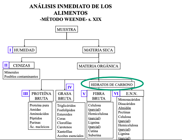 - Hidratos de carbono y otros compuestos orgánicos → FB (fibra bruta) y ENN (extractivos no nitrogenados).