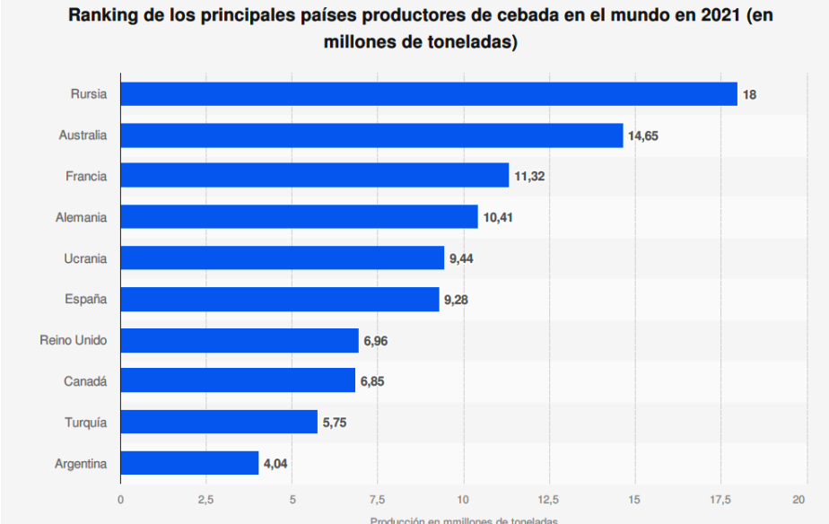 Ranking de los principales países productores de cebada en 2021 (millones de toneladas)