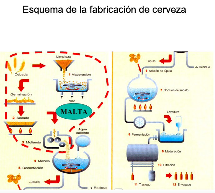 Incluye elementos visuales con texto: “Agua caliente”, “Residuo”, “Lúpulo”.