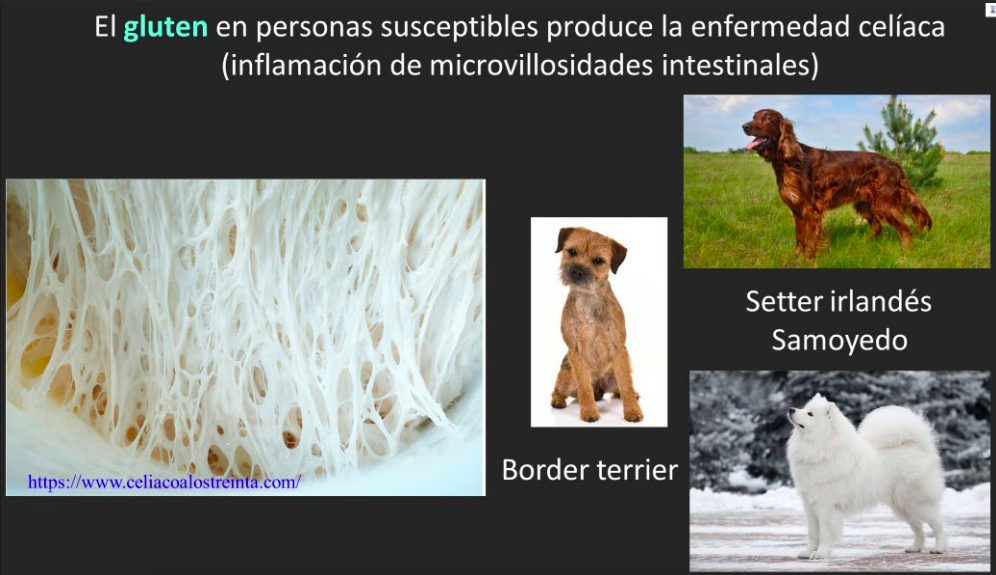 “El gluten en personas susceptibles produce la enfermedad celíaca (inflamación de microvellosidades intestinales).”