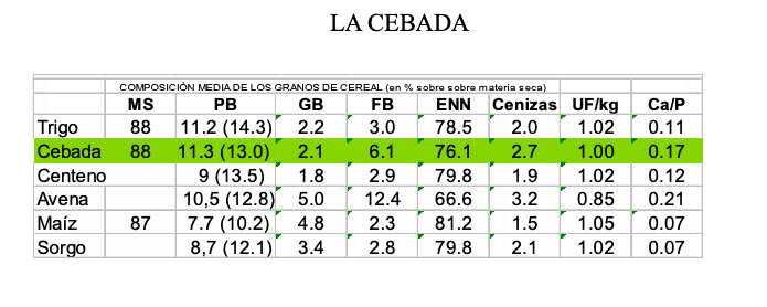 | Cebada | 88 | 11.3 (13.0) | 2.1 | 6.1 | 76.1 | 2.7 | 1.00 | 0.17 |