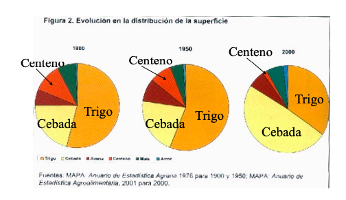 Gráfico visible: evolución de la superficie cultivada en 1900, 1950 y 2000 (trigo, cebada, maíz, avena, centeno).