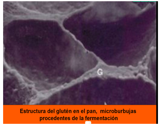 Estructura del gluten en el pan con microburbujas procedentes de la fermentación.