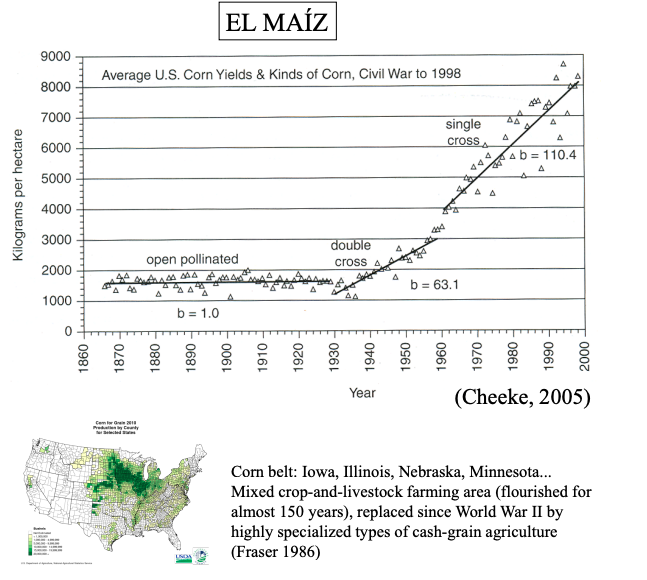 | Maíz reventón | Zea mays everta | Casi exclusivamente vítreo | Grano pequeño, revienta con calor | Industria alimentaria |