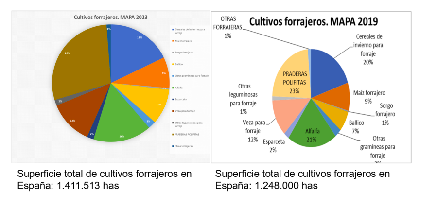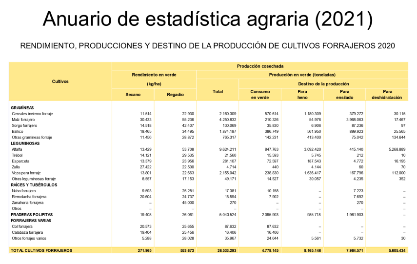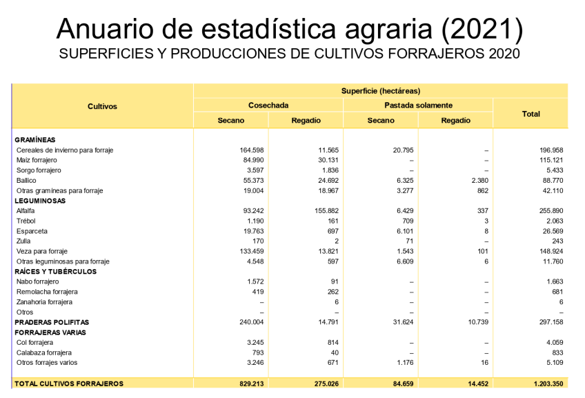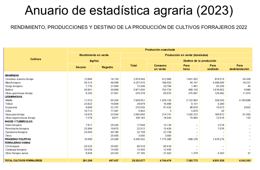 Cereales invierno forraje: 12.666 kg/ha Maíz forrajero: 30.314 Sorgo: 7.770 Ballico: 20.851 Otras gramíneas: 9.293