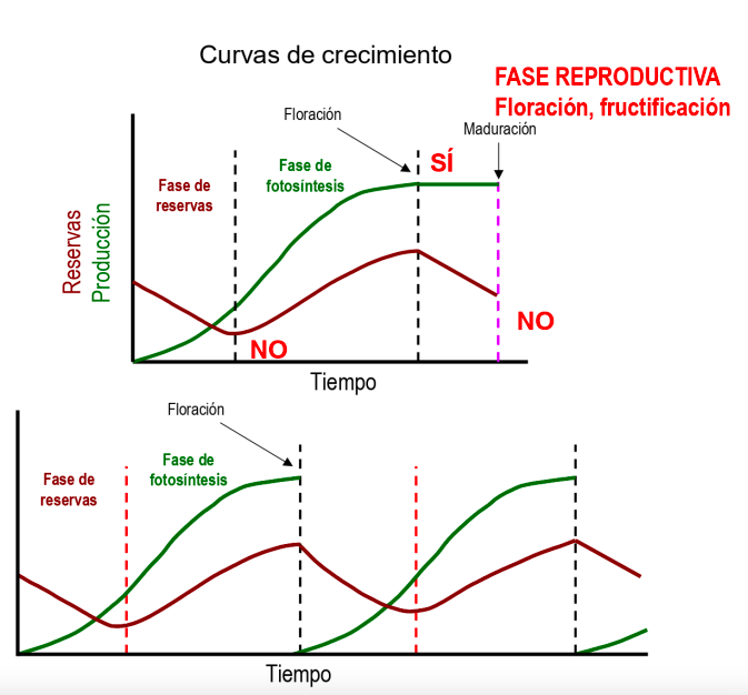 Importante Diferencia entre forrajeras y gramineas es que las forrajeras hay que cortarlas antes de que las reservas vayan al fruto porque si se forman los frutos perderan la capacidad del rebrote y perderan valor forrajero (ya que la energia se va a partes que no nos interesa. Hay que cortar al final de la fase de fotosintesis para tener la maxima acumulacion de reservas.