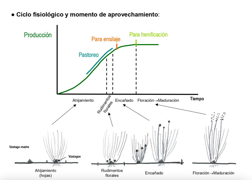 Conforme se desarrolla la planta pierde calidad porque en esas fases la planta se seca. Si lo vamos a usar fresco, se hace a mitad de fase de fotosintesis, mas tarde para ensilado y aun mas tarde para henificacion, pero siempre en fase de encañado, no entrar en maduracion.