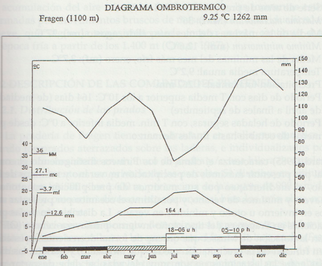 Un diagrama ombrotérmico es un gráfico en el que se representan mes a mes las temperaturas medias (en grados centígrados, ºC) y las precipitaciones medias (medidas en milímetros por metro cuadrado) obtenidos en una estación meteorológica.