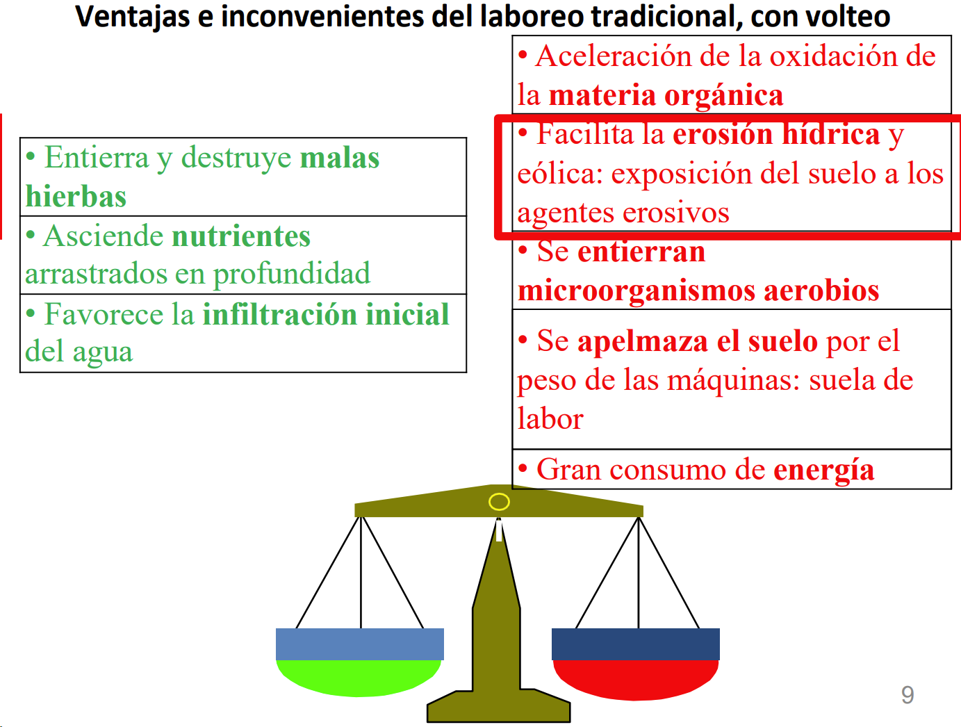| Ámbito | Problemas del laboreo tradicional | Ventajas del laboreo de conservación | Inconvenientes de la siembra directa |