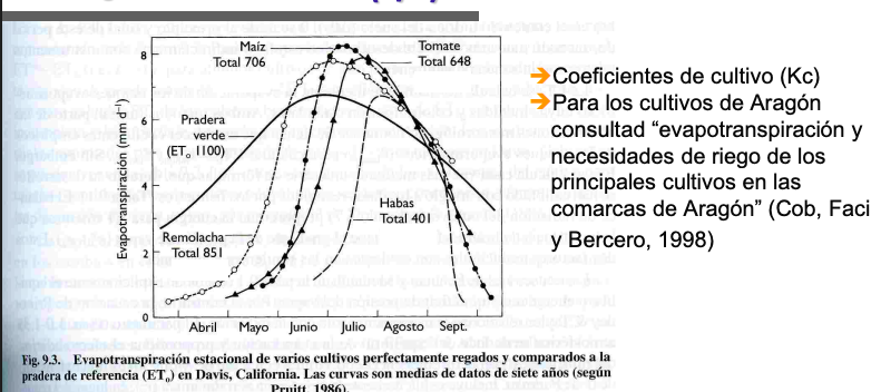 Importante: Para saber cuando y cuanto regar se tiene en cuenta el cultivo de referencia o ETC que es un cultivo de graminieas de altura uniforme, crecimiento activo, que cubre el suelo y no se ve sometido a deficit hidrico. Se expresa en mm/unidad de tiempo y reemplaza al concepto de ETP (Potencial)