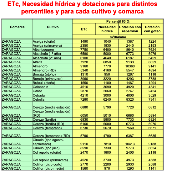 ETc, NECESIDAD HÍDRICA Y DOTACIONES PARA CULTIVOS EN ZARAGOZA (Percentil 80%)