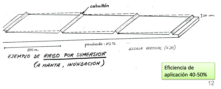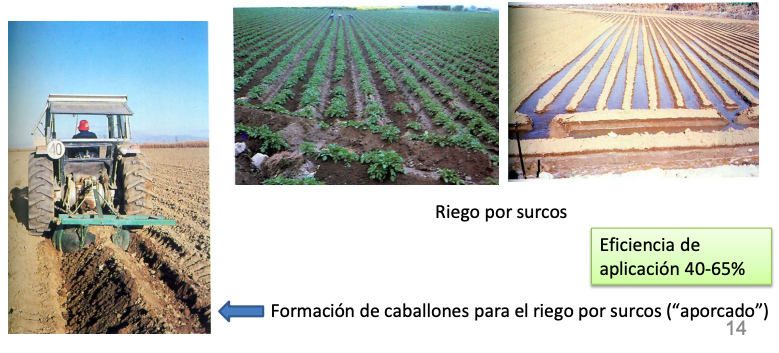 - El agua llega a los surcos por desbordamiento o boquillas desde la acequia principal.