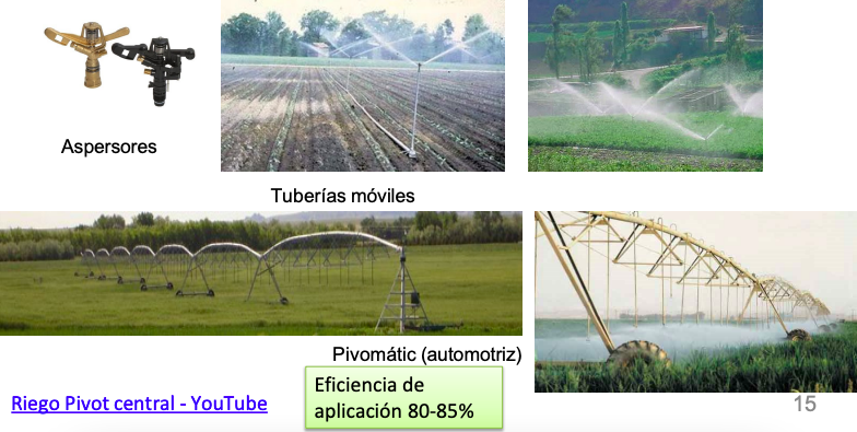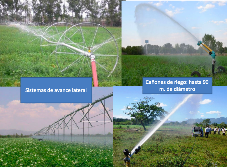 - Requiere grupo de bombeo, tuberías principales y secundarios, aspersores rotativos o estáticos.