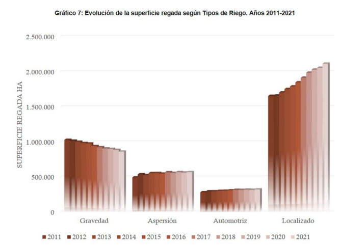 - 2011–2021: aumento del riego localizado y descenso del riego por gravedad.