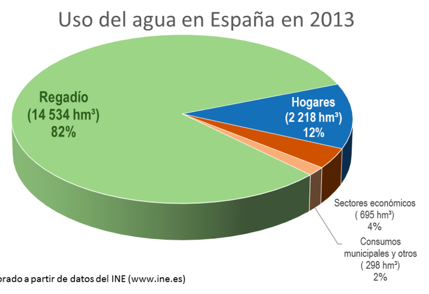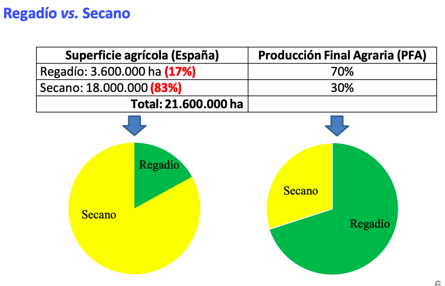 | Regadío | 3.600.000 ha (17%) | 70% |