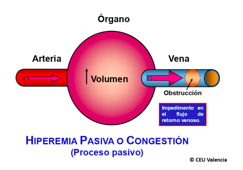 - Hiperemia pasiva o congestión (proceso pasivo): impedimento en el flujo de retorno venoso.