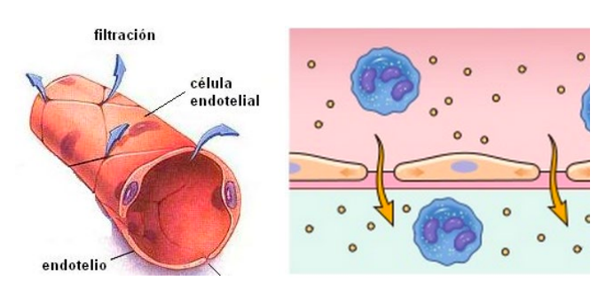 - Paso de leucocitos mediante pseudópodos entre uniones endoteliales
