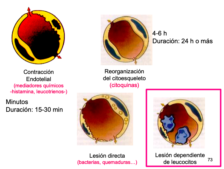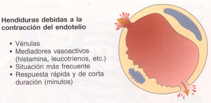 | Transitoria inmediata | Contracción endotelial (histamina, leucotrienos) | Minutos | Vénulas |