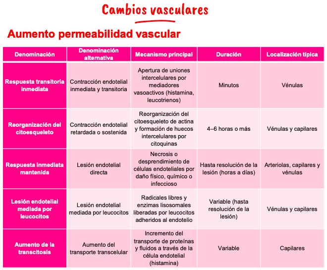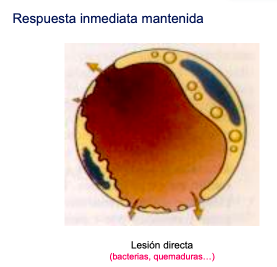 | Inmediata mantenida | Lesión directa (física, química, infecciosa) | Horas a días | Arteriolas, capilares, vénulas |