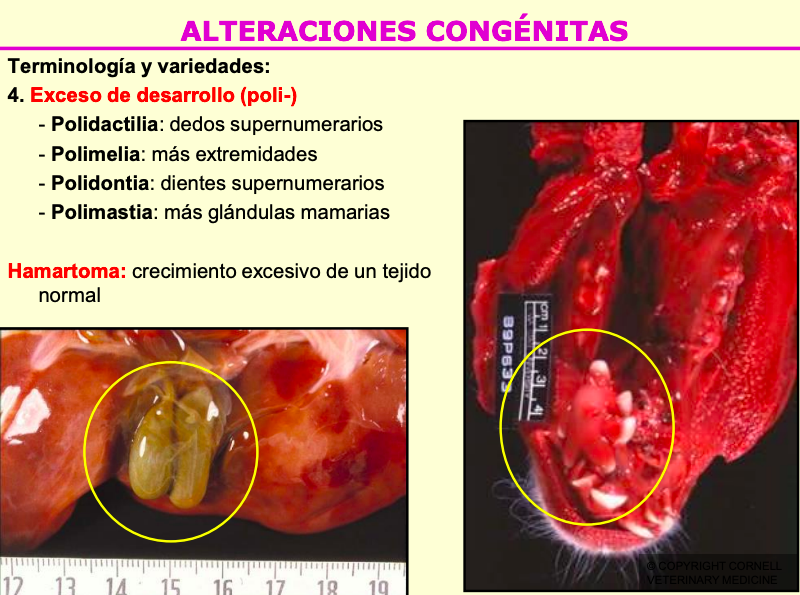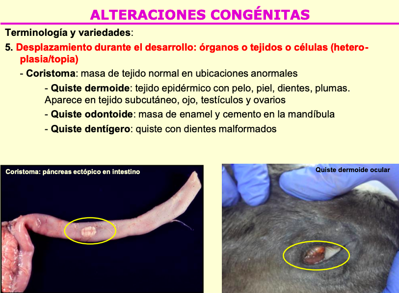 - Quiste dermoide: piel/pelo/dientes/plumas en subcutáneo, ojo, testículos, ovarios