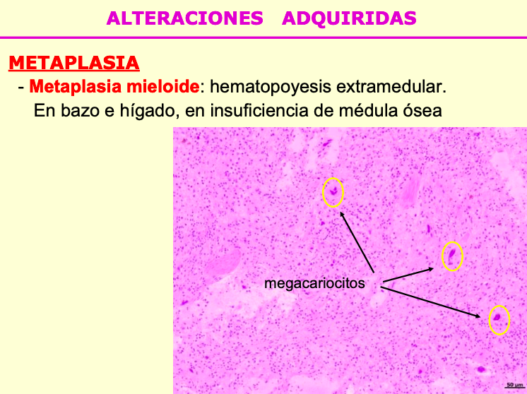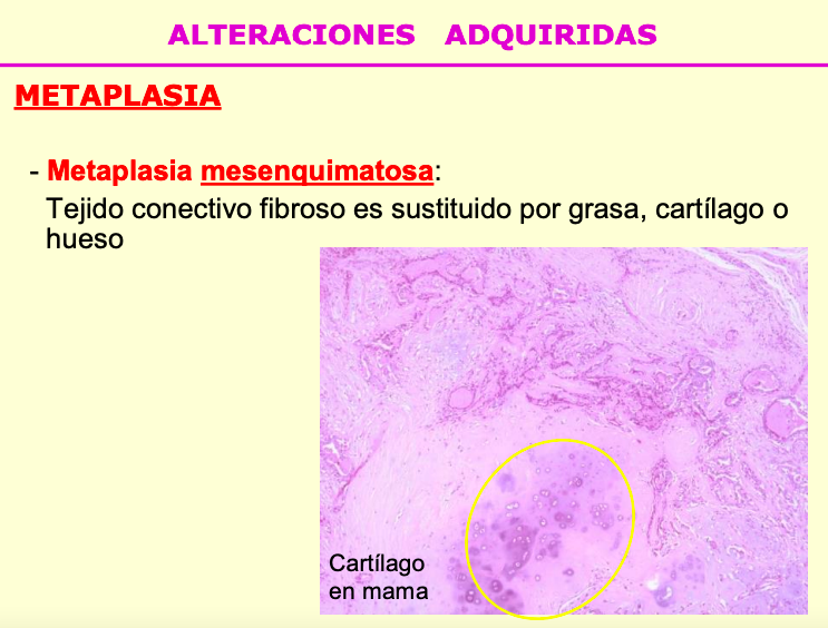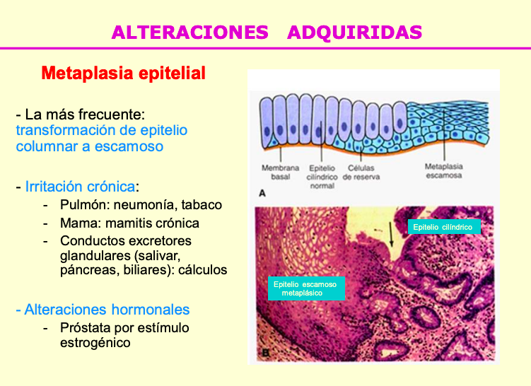 - Metaplasia: cambio o transformación en otra cosa (meta-) de un tejido en otro