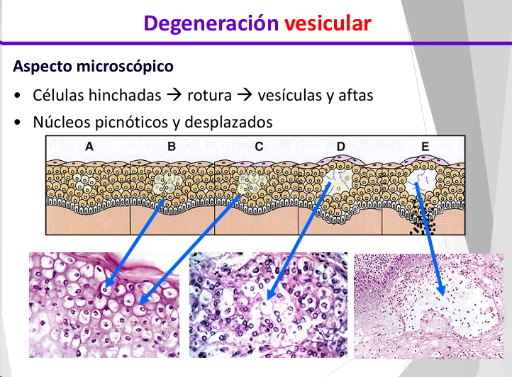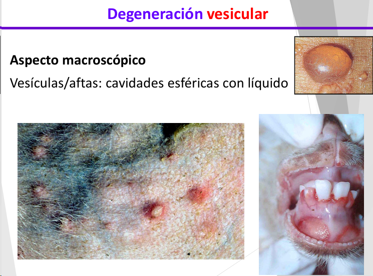 Degeneración vesicular: irreversible, afecta al epitelio plano estratificado (epidermis, lengua, boca, esofago, rumen...)