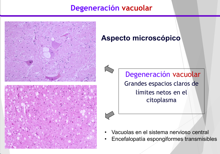 - Degeneración vacuolar: Grandes espacios claros de limites netos en el citoplasma. Vacuolas en el sistema central, encelopatias espongiformes transmisibles