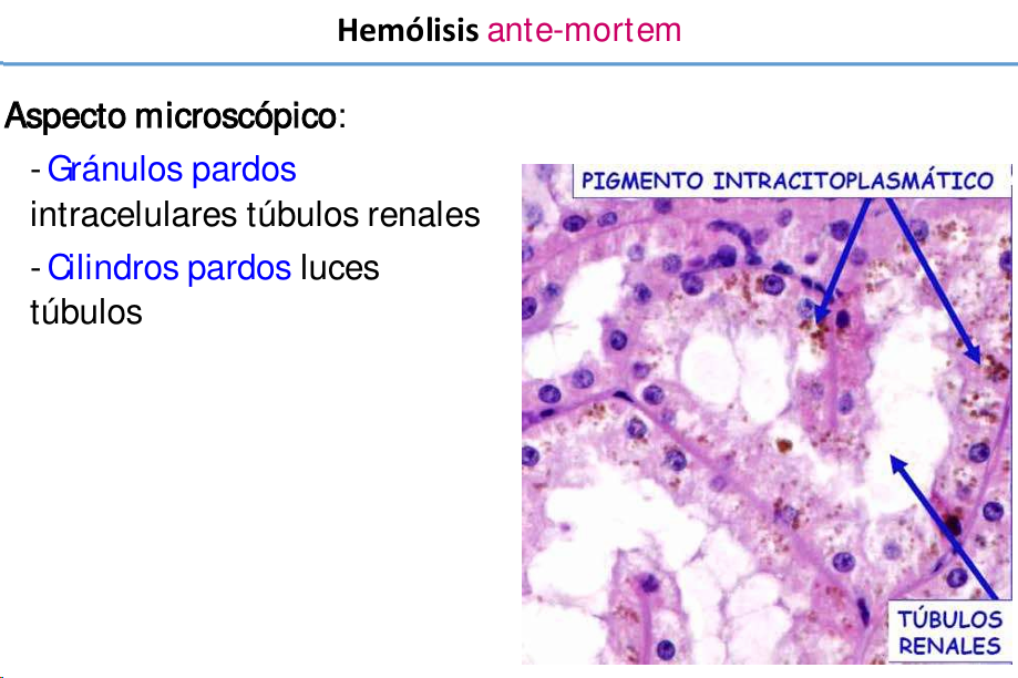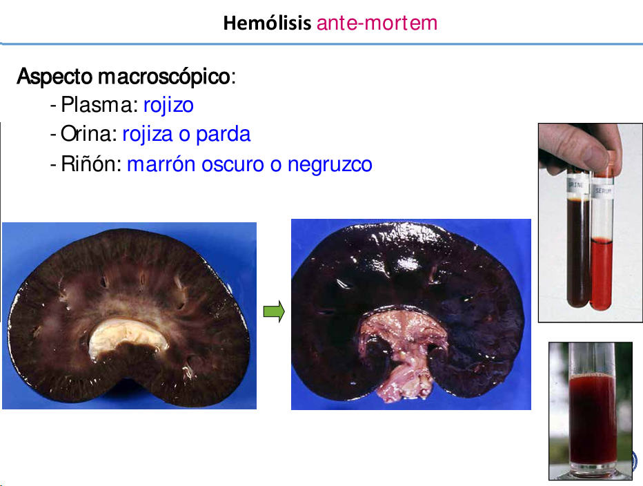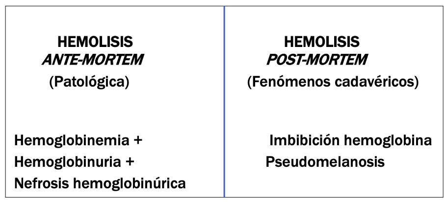 Hay que saber al hacer una necropsia, si los depositos de sangre son ante o post mortem. Hemolisis antemortem causada, por ejemplo por parasitos o nefrosis hemoglobinúrica, es patologico. Hemolisis postmortem es por fenomenos cadavericos, pseudomelanosis (falsa melanina por actividad microbiotica).