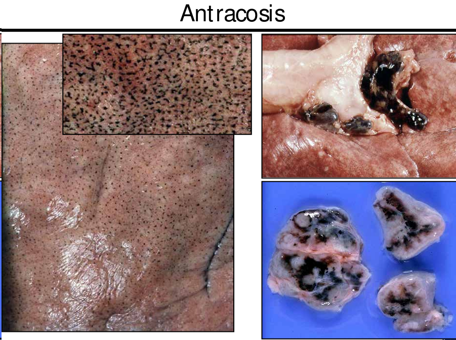 Causado por polvo de carbón que inhalamos y al ser polvo inerte llega al pulmon y linfonodos porque el sistema inmune no reacciona a el, los macrofogos al ser inespecificos lo fagocitan llevandolo desde los alveolos a los linfonodos.