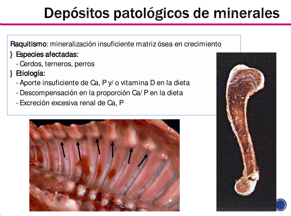 - Raquitismo: mineralización insuficiente matriz ósea en crecimiento. En Animal que de joven no ha tenido una dieta adecuada y han tenido deficiencias durante el crecimiento. No han creacido lo que debian, extermidades arqueadas