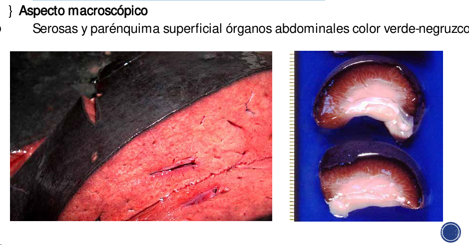 - Hemoglobina + bacterias -> Sulfometahemoglobina Aspecto macroscopico: seroso y parenquima superficial en organos abdominales, color verde-negruzco que no profundiza en los tejidos