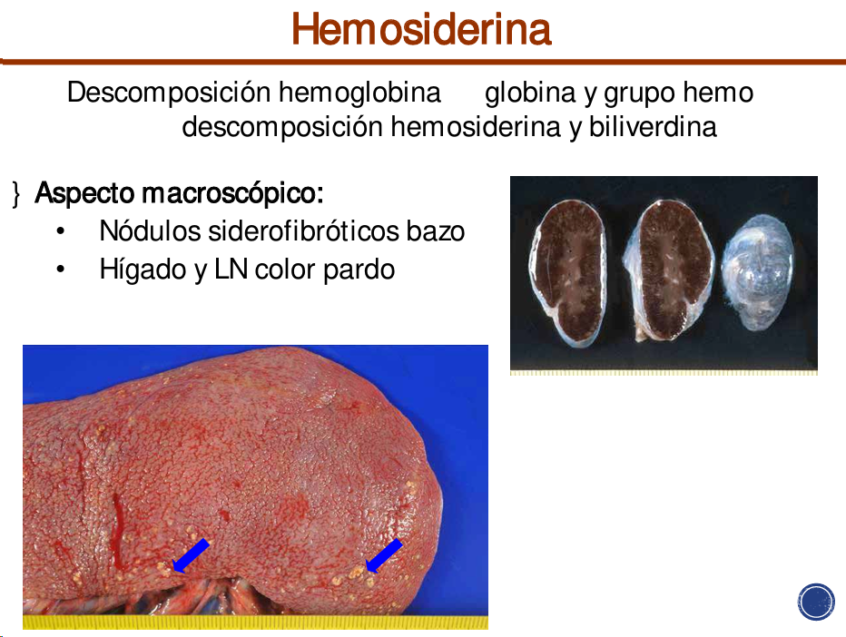 De aspecto macroscópico se ven nódulos siderofibroticos en el bazo NO patológico, normal en animales mayores. Macroscópicamente: vemos pigmento pardo, Kupffer y hepatocitos