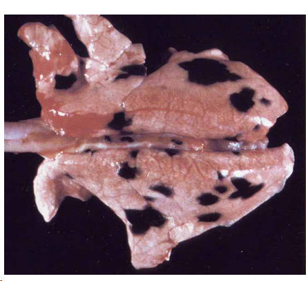 Se ve como pequeños punteado en todo el pulmon y en el linfonodo da un caracter negruzco con manchas difusas grandes