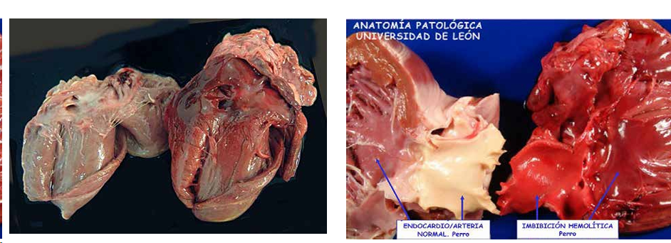 - Aspecto macroscópico: pigmentación rojiza endocardio y arterias