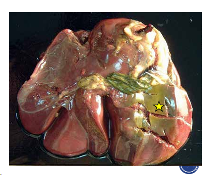 Aspecto macroscópico: Pigmentación verdosa, periférica a la vesícula biliar.