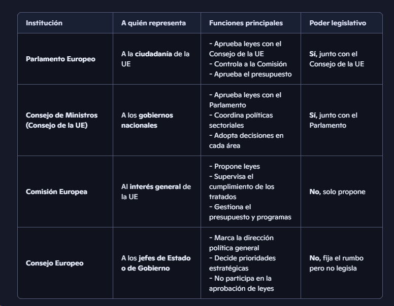 - Compartidas con los estados miembros: Legislan UE y estados, prioridad de la EU. Agricultura, transporte, energia. La UE fija un minimo comun, los estados pueden aplicar normas mas estrictas, no menos