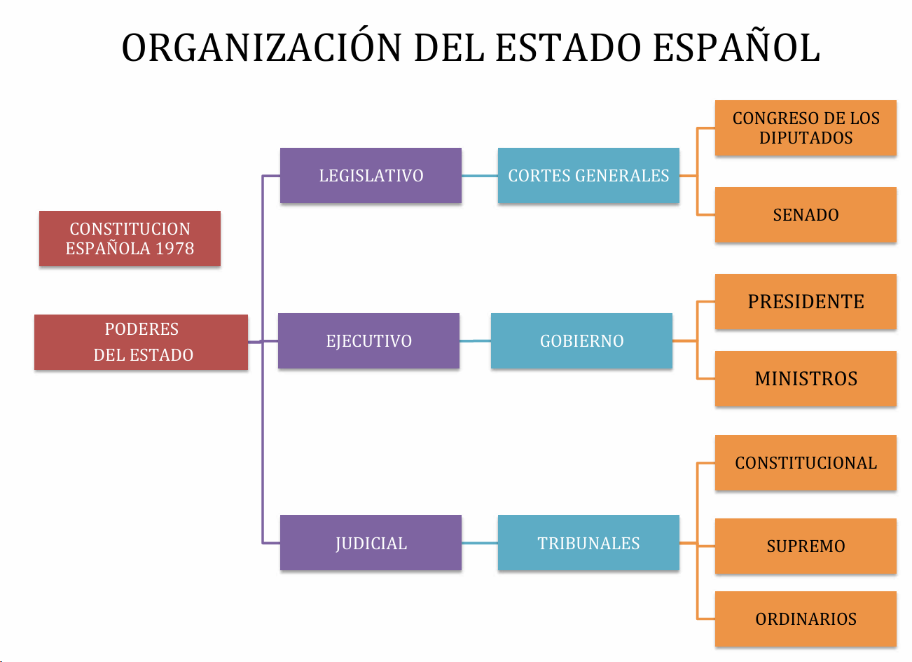 - Judicial, tribunales. Está el constitucional, supremo y ordinario