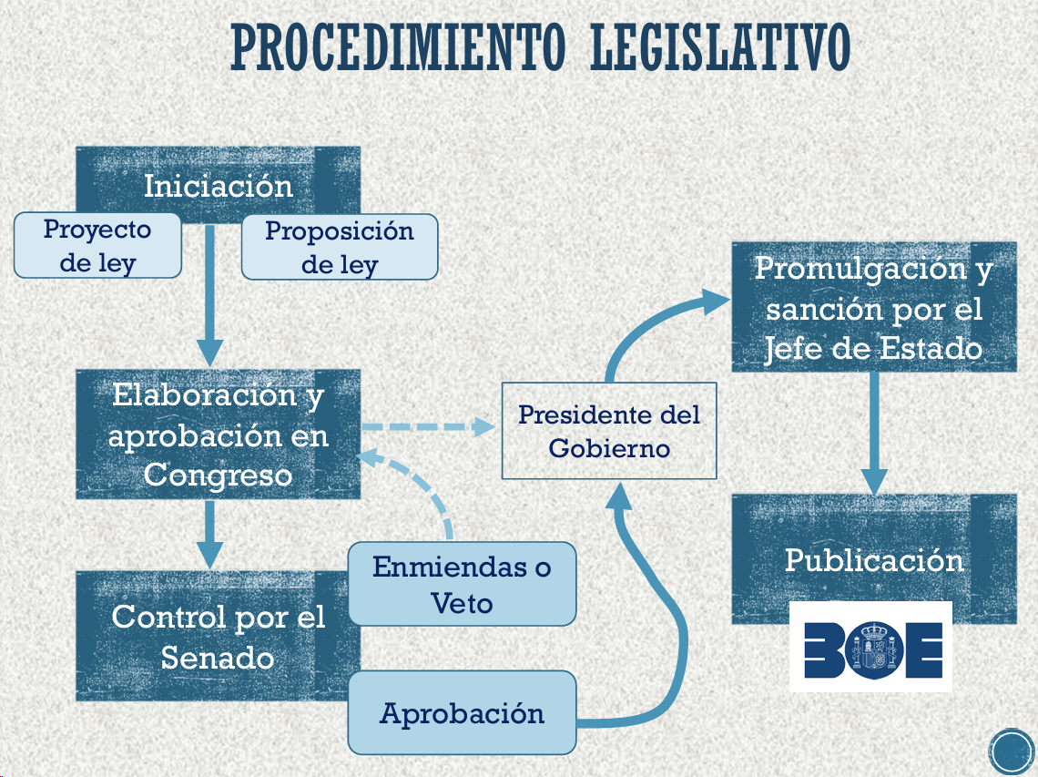 Tras la iniciación se elabora y aprueba en el congreso, el senado lo enmienda o aprueba y el presidente del gobierno lo promulga y elige las sanciones. Después se publica en el BOE