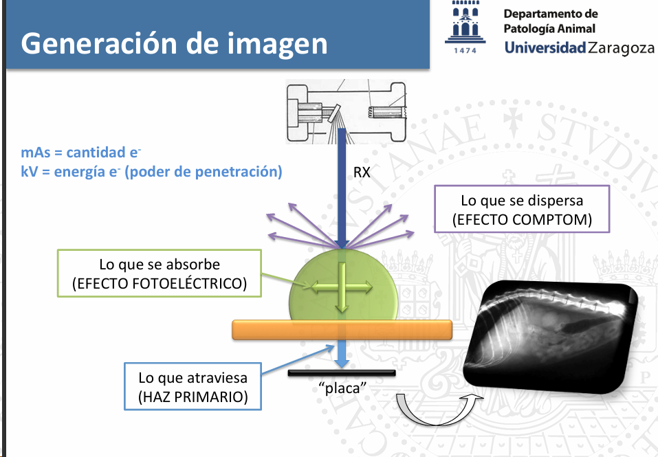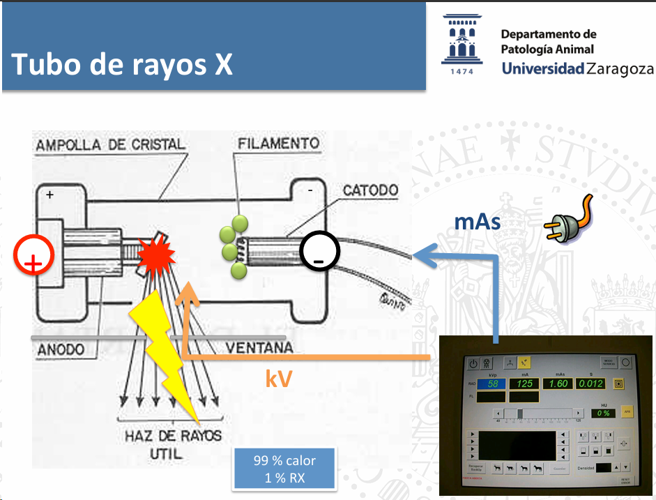 De cada 100 electrones que impactan en el anodo solo 1 produce un rayo X, el resto es calor. Los rayos al bajar a la placa parte se atraviesa (haz primer0), parte se dispersa (efecto compton) y parte se absorbe (efectofotoelectrico)