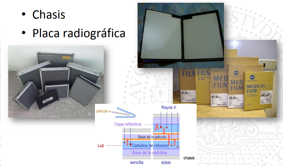 Generación de imagen: El receptor de imagen o ''Placa'' es un Película radiográfica que sirve como Intensificador de imagen, formado porFósforo estimulable y son detectores semiconductores.