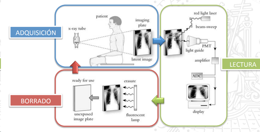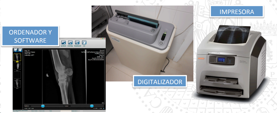 - Placa de fosforo (IP) + chasis especial + digitalizador + ordenador y software + (impresora)