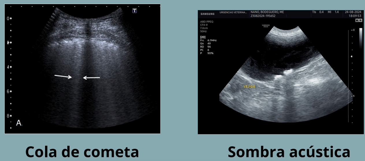 NO CONFUNDIR COLA DE COMETA Y SOMBRA ACUSTICA. La cola de cometa presenta haces hiperecoicos, la sombra acustica haces hipoecoicos.