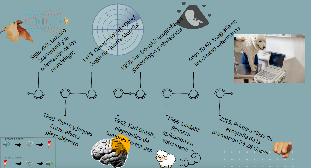 Comenzó con el estudio de los murcielagos, tras la creación del sonar se empezo a usar para diganostico de tumores cerebrales y embriologia al poder ver cosas que los rayos x no podian o en casos en los que las radiaciones no eran recomendables. Mas tarde 1966 se introdujo en la veterinaria.