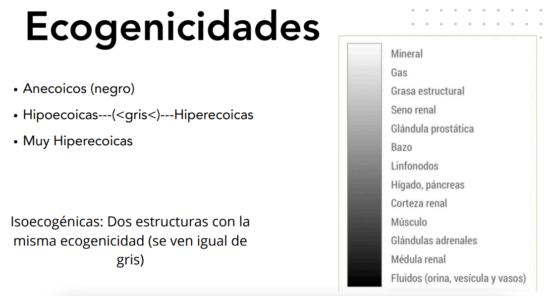 Hipoecoico o Hiperecoico dependiendo del la luminosidad. Higado hipoecoico con respecto al bazo). Pero hay tejidos isoecogenicos que significa que tienen la misma ecogenicidad.