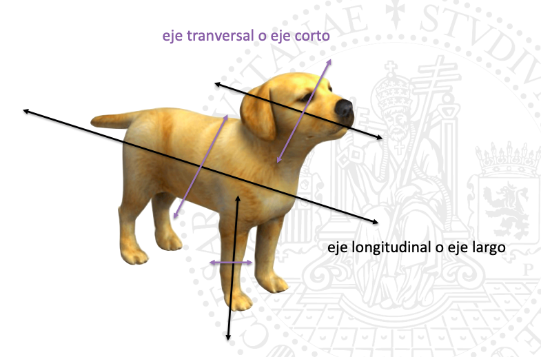 Ejes cortos son transversales, longitudinales son los largos. Hay plano transversal, sagital (o medio, paralelo al eje longitudinal) y dorsal/ventral: