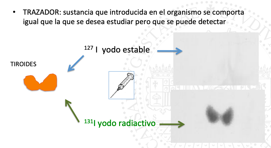 Medicina nuclear: • Isótopos estables/ isótopos radiactivos • El elemento es el mismo • La radiación la podemos detectar • Características del radionúclido – Preferiblemente que emita gamma – Entre 100 y 500 KeV – Periodo de semidesintegración corto