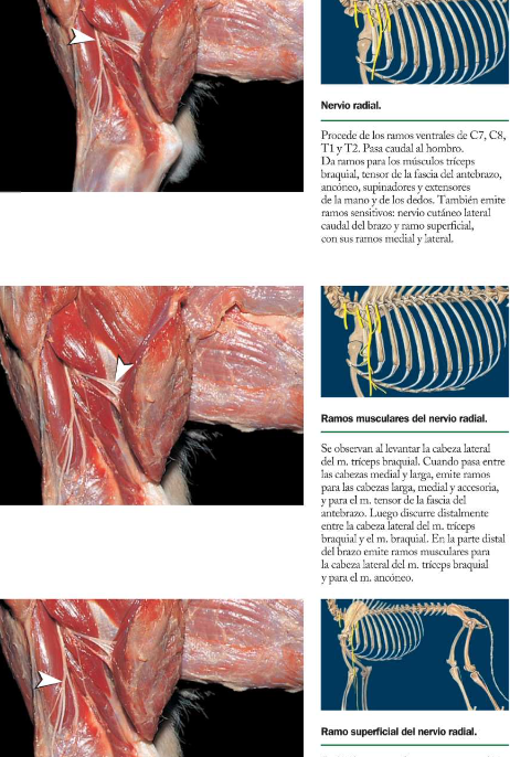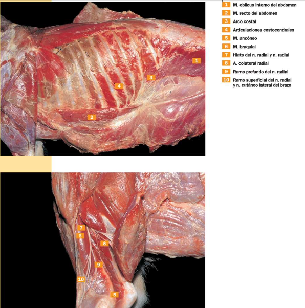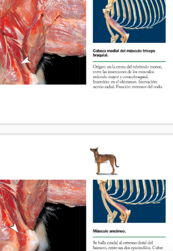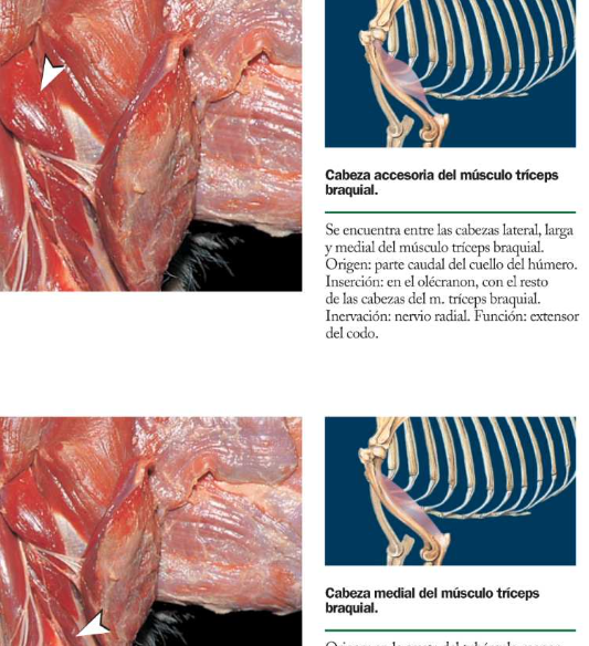 Triceps: Cabeza lateral, cabeza larga (caudal) cabeza accesoria (Profunda bajo lateral, solo en carnivaros) y medial bajo la accesoria y medial
