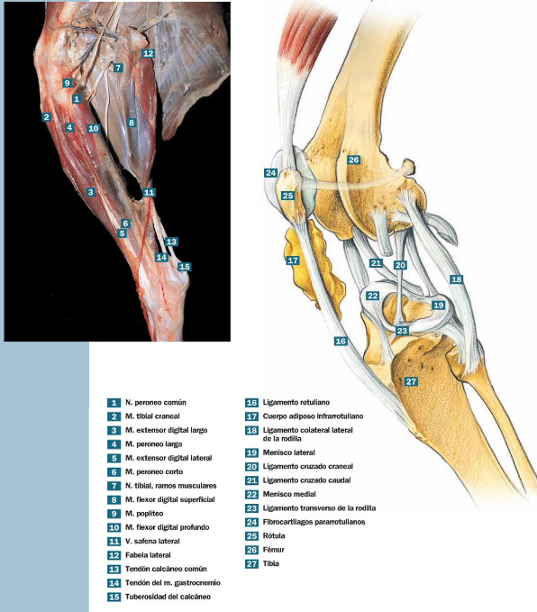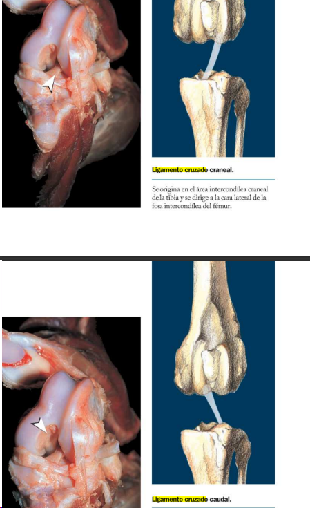 En vision craneal de la rodilla vemos la troclea femoral, los condilos femorales, el tendon extensor digital largo hacia lateral. entre los condilos femorales (fosa intercondilea tenemos el ligamento cruzado craneal (mas lateral y superficial) y el ligamento cruzado caudal(mas medial y caudal) delante el ligamento transverso de los maniscos encima de los meniscos. Ligamento colateral medial de la rodilla en parte medial